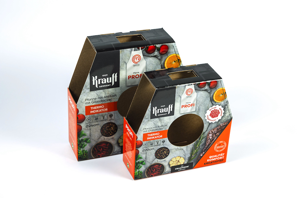 - Прочная упаковка из гофрокартона или микрогофрокартона. Для изготовления прочной упаковки, оформленной в фирменном дизайне, мы используем метод каширования - приклеивания листа картона с печатью к листу гофрокартона. В такие красочные и прочные коробки упаковывается хрупкая посуда и посуда с большим весом, например, чугунные сковородки.