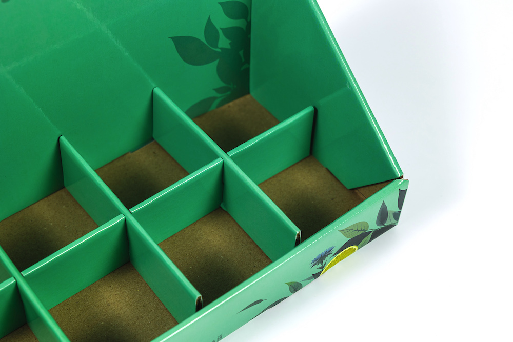Cardboard boxes with inserts can be used to pack several types of goods in one box or to secure one product. Cardboard is a flexible material, thanks to the many folds (folds) one cardboard sheet can be formed into an insert with several cells, and any printing can be applied to the cardboard insert.